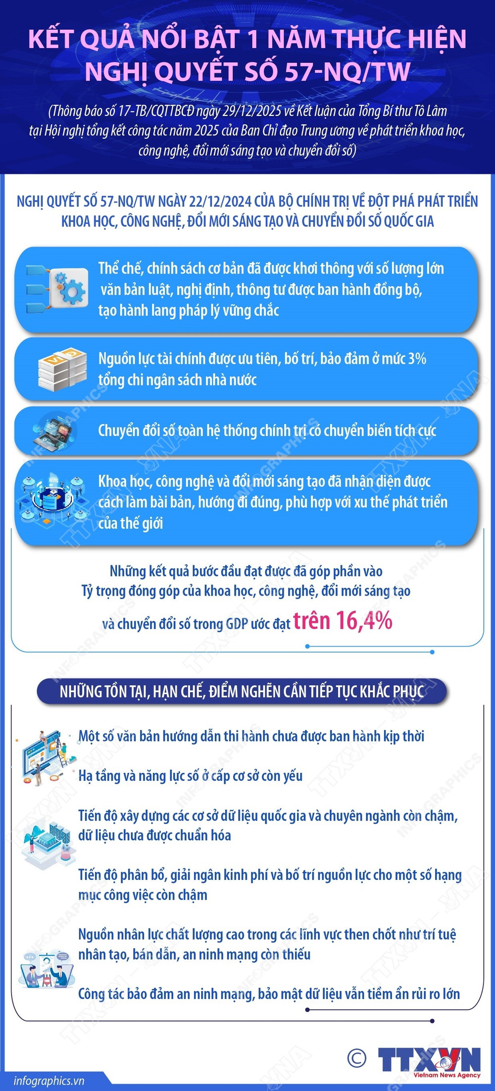 Cơ quan Thường trực Ban Chỉ đạo Trung ương về phát triển khoa học, công nghệ, đổi mới sáng tạo và chuyển đổi số vừa ban hành Thông báo Kết luận của đồng chí Tổng Bí thư Tô Lâm, Trưởng Ban Chỉ đạo tại Hội nghị tổng kết công tác năm 2025 và nhiệm vụ, giải pháp trọng tâm năm 2026 của Ban Chỉ đạo Trung ương ngày 25/12/2025 (Thông báo số 17-TB/CQTTBCĐ, ngày 29/12/2025).